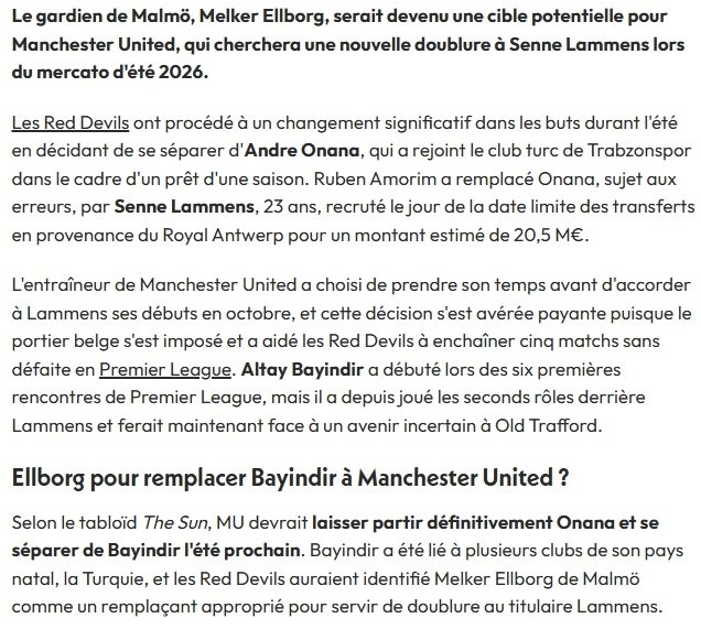 Manchester United, hem Onana ile yolları tamamen ayırmayı hem de Altay Bayındır'ı elden çıkarmayı planlıyor. Altay'ın Türkiye'den birçok kulübün radarında olduğu ifade edilirken, United'ın yeni yedek kaleci adayının ise Malmö'nün 22 yaşındaki file bekçisi Melker Ellborg olduğu ifade edildi.