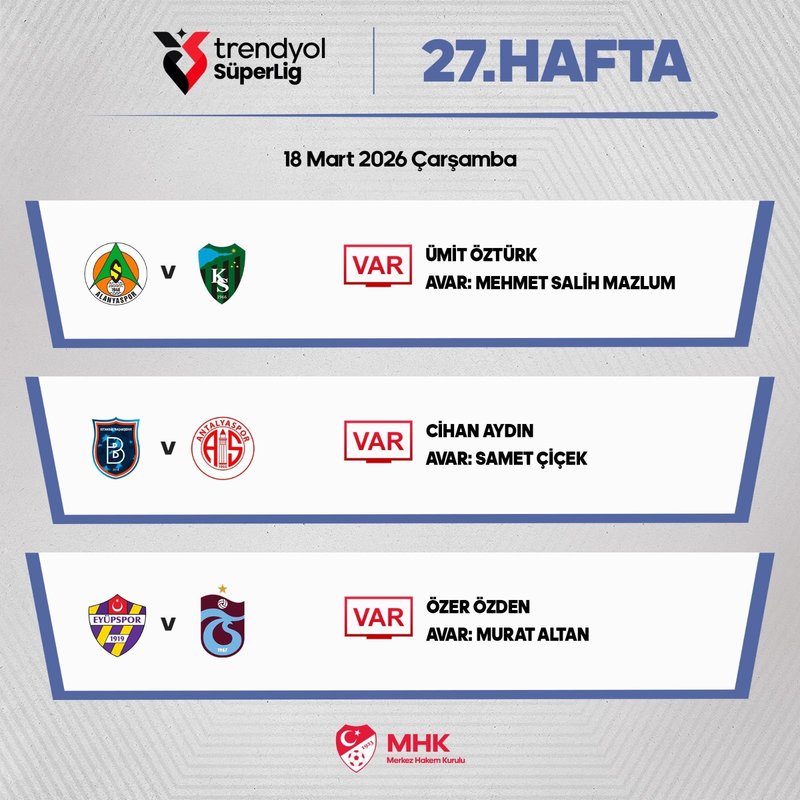 Trendyol Süper Lig'in 27. haftasında 18 Mart Çarşamba günü 3 maç oynanacak. Mücadelelerin VAR hakemleri ise belli oldu. MHK'den yapılan açıklamaya göre, ikas Eyüpspor-Trabzonspor maçının VAR hakemi Özer Özden olarak açıklandı. Özden'e AVAR'da ise Murat Altan'ın eşlik edeceği öğrenildi.