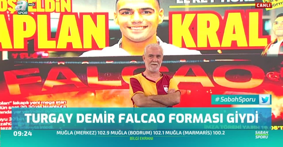 "Galatasaray, Falcao'yu rüyasında görür" diyen A Spor yorumcusu Turgay Demir, verdiği sözü tutarak Galatasaray forması giydi. Demir, "Falcao benim gençliğime benziyor. Bu sezon 25 gol atar. Muriç de iyi golcü ama Falcao'nun olduğu yerde Falcao gol kralı olur" dedi.